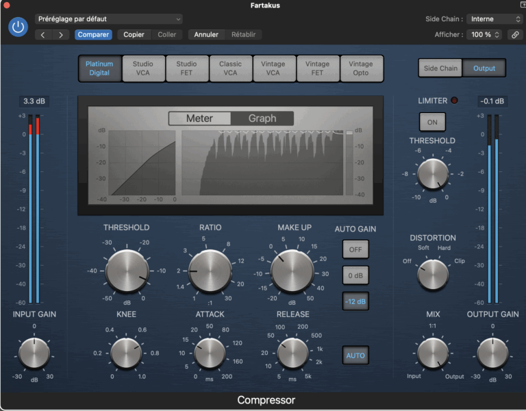 Le compresseur permet de réduire la dynamique (différence entre le volume maximum et le volume minimum d’un son) d’un signal audio en réduisant le volume des parties qui dépassent un certain seuil prédéfini.